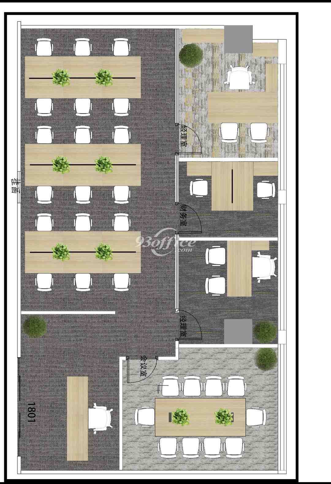 功能布局:logo墙+3隔断(老板间+财务室+10人位会议室)+18工位